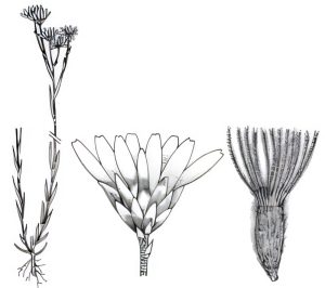 Erect, annual herb to 35 cm high. Dense cottony stems and linear to lanceolate leaves (10-50 mm long). Loosely clustered terminal head of white papery daisy flowers (Sep-Dec).